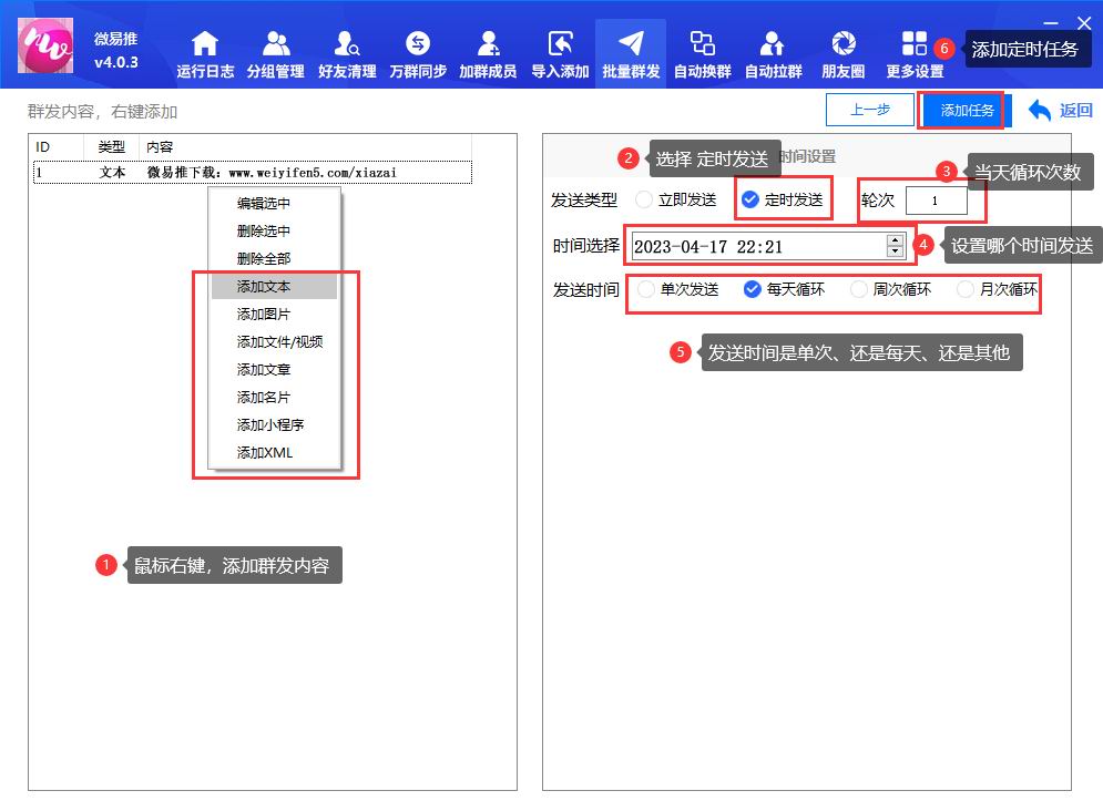 批量群发:微云客提供了批量群发好友和群组的功能,支持定时循环群发。这样,用户可以方便一次性向多个好友或群组发送消息,节省时间和精力。